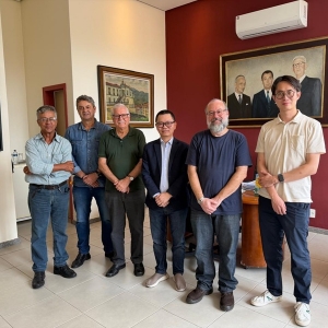 Na foto do encontro, estão presentes, da esquerda para a direita: Eng. Fernando José Gomes ( diretor de projetos do DETEMM), Eng. Paulo Sérgio Sant'Ana Furtado (diretor do DETEMM - Departamento de Tecnologia em Mineração e Metalurgia da FG), o Prof. Cristovam Paes de Oliveira (Presidente Executivo da FG) e da equipe da SAM, Yongshi Jin, Jário Fernando Pires Júnior e Eason Wang.
